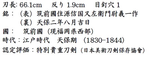 Катана Minamoto Nobukuni Эпоха Эдо, Тенпо эра (1830). Монтировка меча стиля Учигатана. Катана периода синто. Мастер Нобукуни Minamoto Nobukuni 源信國 Важная Культурная Ценность Японии (重要文化財, jūyō bunkazai). Настоящий меч - катана - форма клинка shinogi-zukuri, киссаки среднего размера chu-kissaki, с поверхностью клинка вида отполированной древесины ko-itame. Линия рисунка закалки хамона чистая, вида Онотарэ, с легкой волной и зигзагообразной светлой линией гуноме.