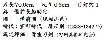 - Омотэ-мей 表銘: Bizen Nagafune Sukesada 備前長船助定